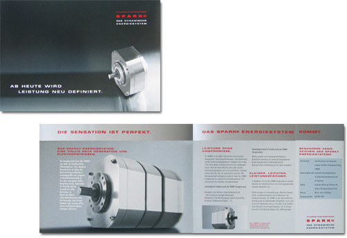 Produkteinführungsfolder „SPARK”, Imagebroschüre Arbeitsprobe: Titel und Innenseiten des SPARK- Produkteinführungsfolders Zielgruppe: Praktisch alle Bereiche, in denen ein elektrisches Antriebssystem oder ein Generator zum Einsatz kommen soll ![]() |