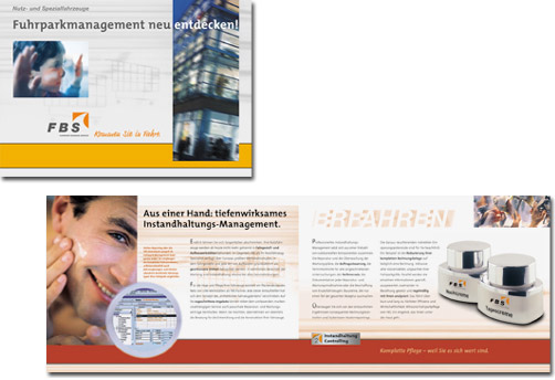 Sloganentwicklung, Image- broschüre und -mappe, bereichsspezifische Angebots- blätter, Leistungsübersicht, Folien-/Powerpointvortrag Arbeitsprobe: Titel und eine Doppelseite der FBS-Image- broschüre (die Kaufhauswelt als kommunikative Plattform schafft Analogien zur Leistungsvielfalt von FBS; Körperpflege steht z.B. für Instandhaltungs-Management) Zielgruppe: Gewerbebetriebe, Kommunen und Gemeinden ![]() |